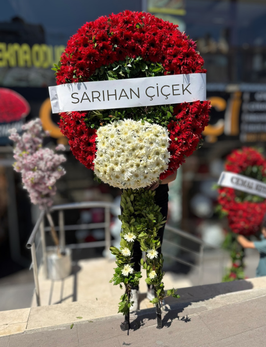 Taze ve sade çiçeklerle oluşturulan tasarım, kurum ya da birey adına hazırlanabilir. Üzerine isim ya da taziye mesajı eklenir ve belirlenen saat aralığında tören alanına teslim edilir.