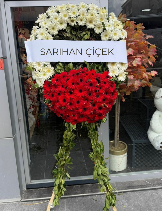 Taze ve sade çiçeklerle oluşturulan tasarım, kurum ya da birey adına hazırlanabilir. Üzerine isim ya da taziye mesajı eklenir ve belirlenen saat aralığında tören alanına teslim edilir.